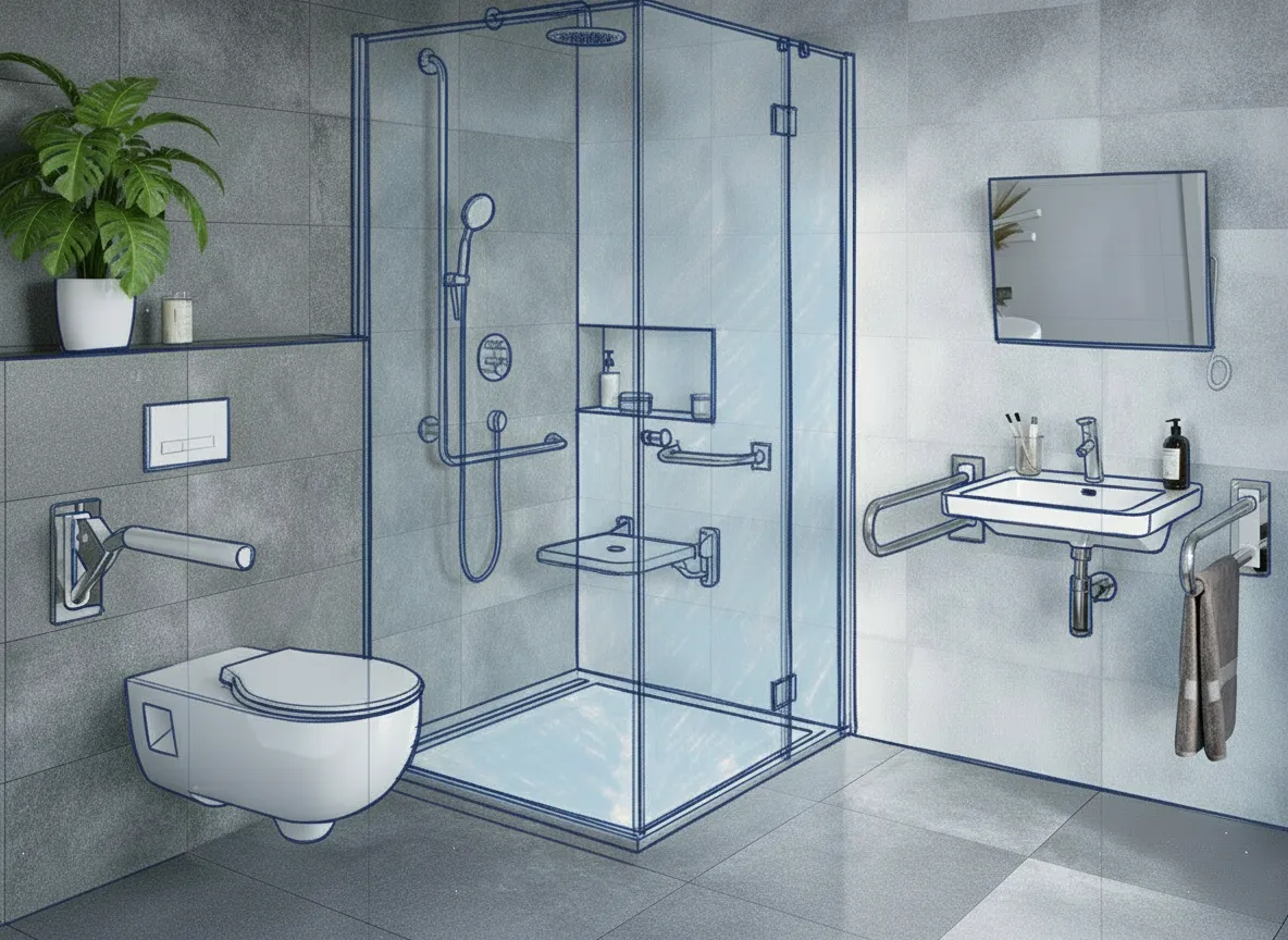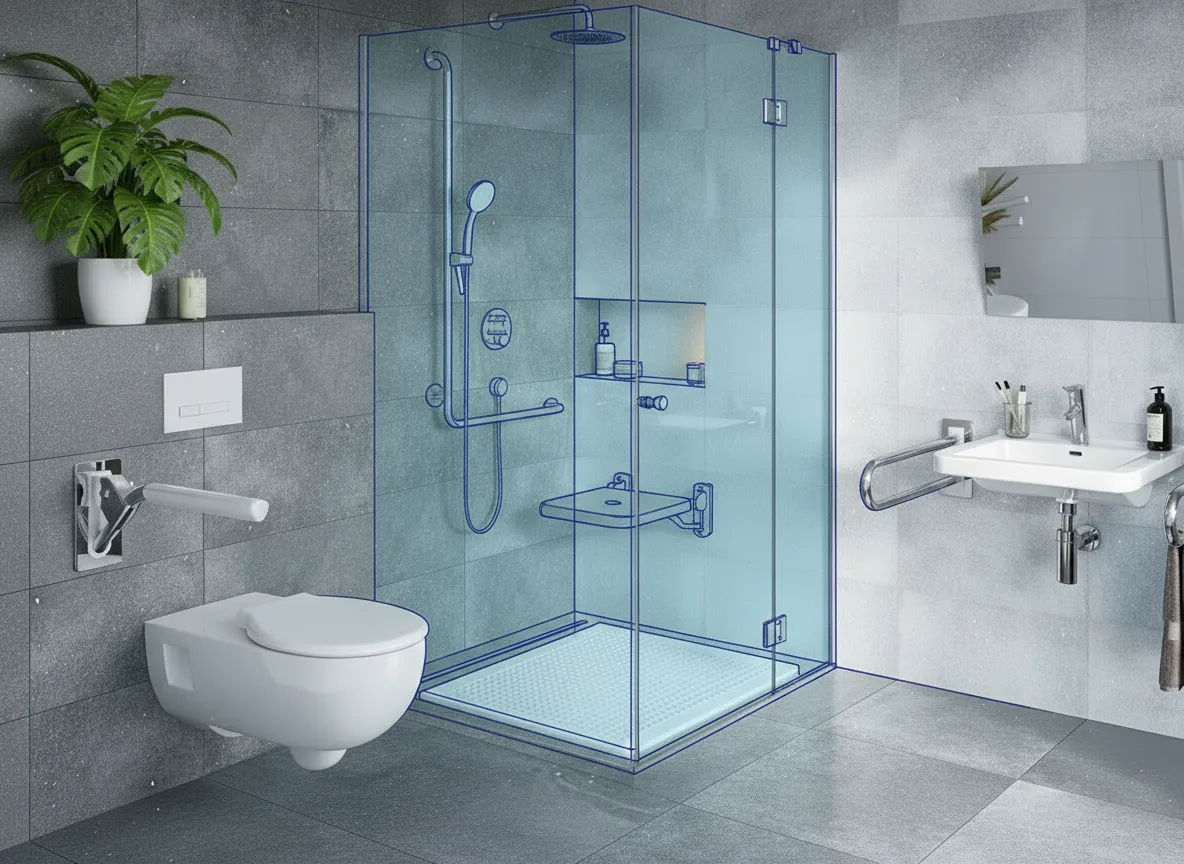 Barrierefreies Design mit bodengleicher Dusche, Haltegriffen und rutschhemmenden Oberflächen